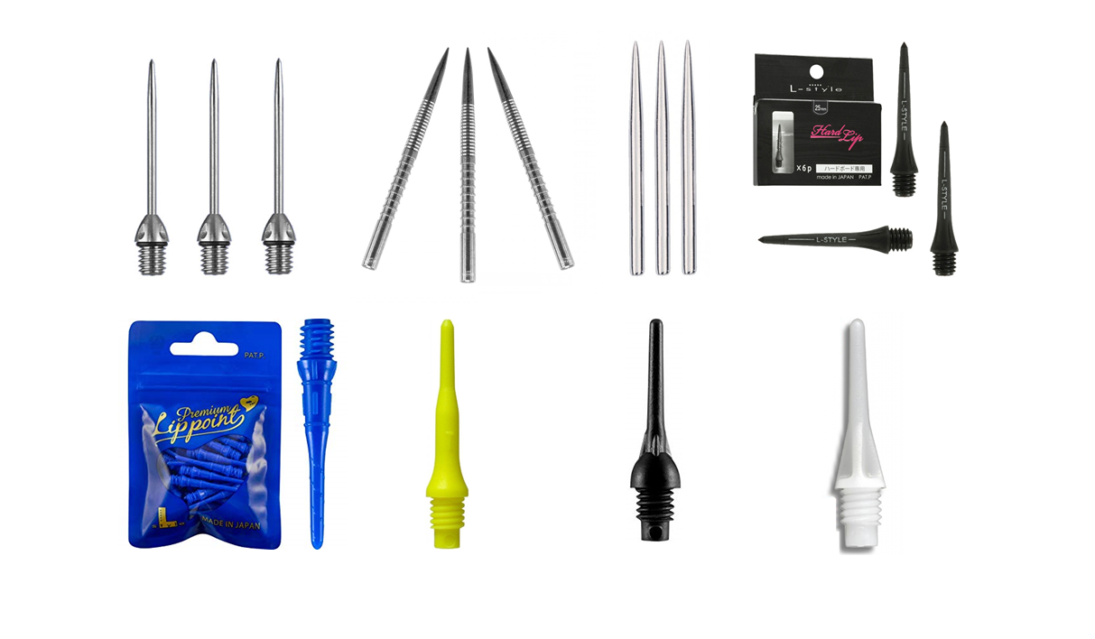 Es gibt verschiedene Arten von Spitzen, bestehend aus Kunststoff („Soft“), oder Stahl („Steel“). Man kann ebenfalls aufschraubbare Stahlspitzen für Softdarts erwerben, sogenannte "Conversion Points". Für Softdarts Spieler die auch zwischendurch auf einem Steel Darts Board spielen empfehle ich die aufschraubbaren Hard Lip von L-Style, da sie zum Gewicht der Kunststoff Spitze identisch ist und somit sich das Flugverhalten des Darts nicht ändert. Bei Stahlspitzen die in verschiedenen Längen und Ausführungen erhältlich sind sollte man nur beachten, dass sie vor Gebrauch mit einem Sharpener (Schleifstein) aufgeraut und die Spitze leicht abgerundet werden um Bouncer zu vermeiden. Als „Bouncer“ werden alle Darts bezeichnet, die am Board abprallen oder aus dem Board fallen. Wie schnell eine Kunststoff Spitze beim Soft Darts abbricht hängt meist vom Wurfstil ab. Heut zu tage werden schon sehr gute Materialien verwendet.