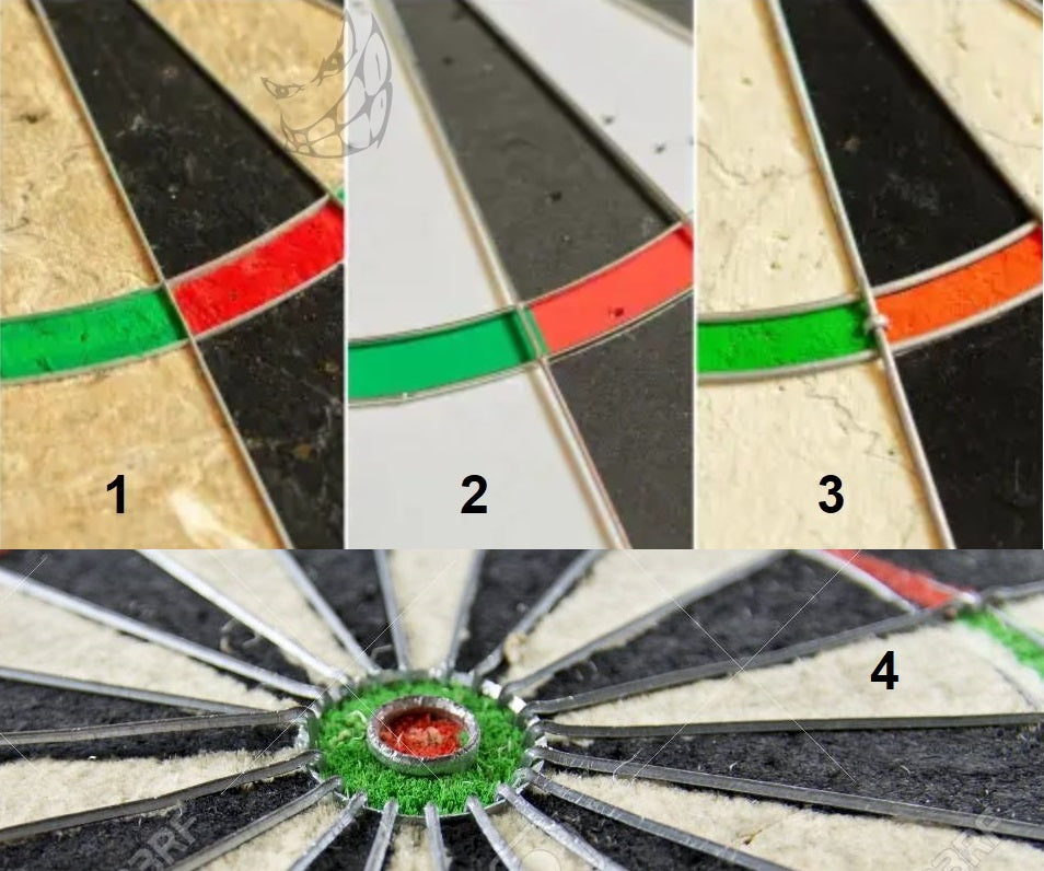 Bild 1 zeigt ein optimales und langlebigeres Profi Dart Board. Hierbei wurde für die Teilung der Segmente am Board kein Draht verwendet, sonder ein dünnes Blech das tiefer ins Board reicht. Vorteil bei solchen Boards sind, weniger Abpraller (Bouncer) und das Blech verbiegt sich sehr schwer.