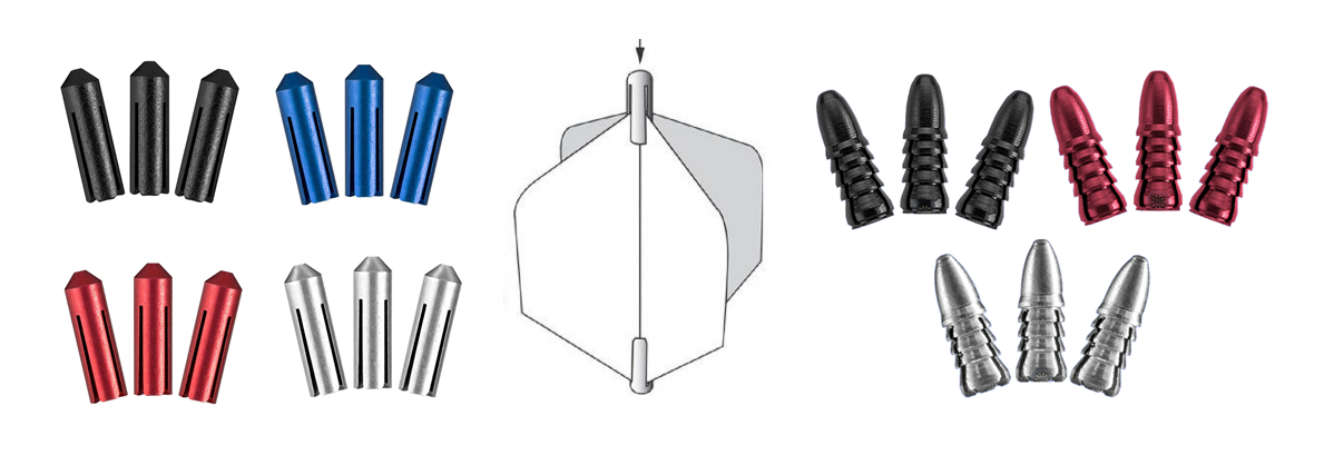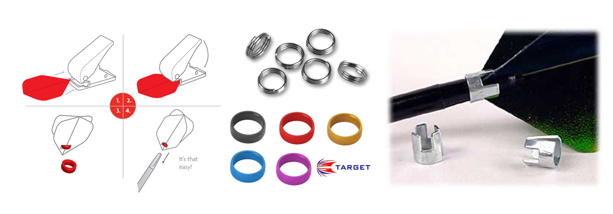 Collars benutzt man nur bei Nylon-Schäfte. Es gibt verschiedene Arten, der Zweck ist allerdings immer der gleiche, Collars sollen das Ende des Nylon-Schafts zusammendrücken und somit den Flight fest mit dem Schaft halten. Bei Ringe sollte man immer den Innendurchmesser beachten, da Schäfte je nach Hersteller unterschiedlich stark sind. Zum Lochen der Flights benötigt man ein Werkzeug "Flight Punch"