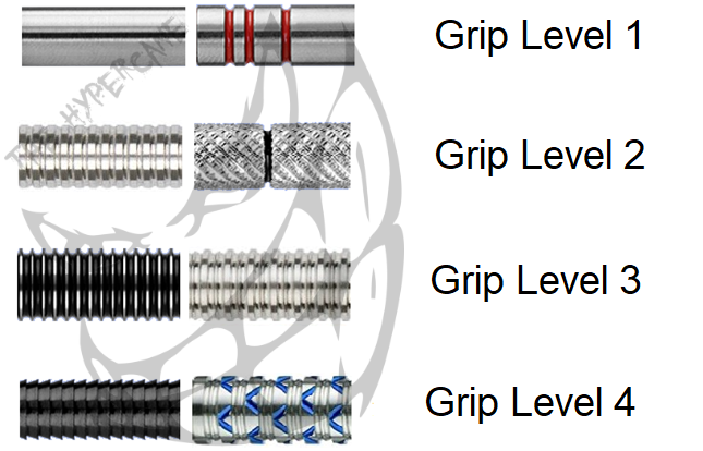 Level 4: Zeichnet sich durch allerhöchsten Grip aus. Die Barrel Oberfläche besteht meist nur noch aus Gripzonen, überwiegend kommt der Shark bzw. Razor Grip zum Einsatz. Einige Dart Barrels besitzen mittlerweile sogar einen Ultra Shark Grip, der den ultimativen Halt am Barrel gewährleistet.